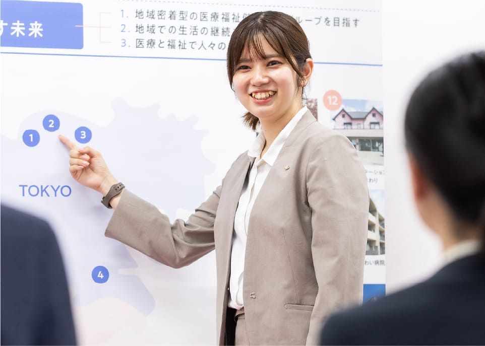 見える景色が、成長を加速させる 総合職の役割は、施設運営の裏側を支えることにとどまりません。医療・福祉と地域をつなぐ中で、医師や看護師などが専門業務に集中できる環境を整え、患者さまの未来を見据えた選択肢を提案し、時にはグループ全体を動かす経営判断も担います。配属先だけでなく、グループ全体の施設間の連携や地域の動向にも目を向け、全体の流れを読みながら意思決定を行います。その過程で養われるのは、複雑な状況を読み解き、道を切り拓く力です。現場と社会の両方を見渡す視野が、あなたの可能性を大きく広げていきます。